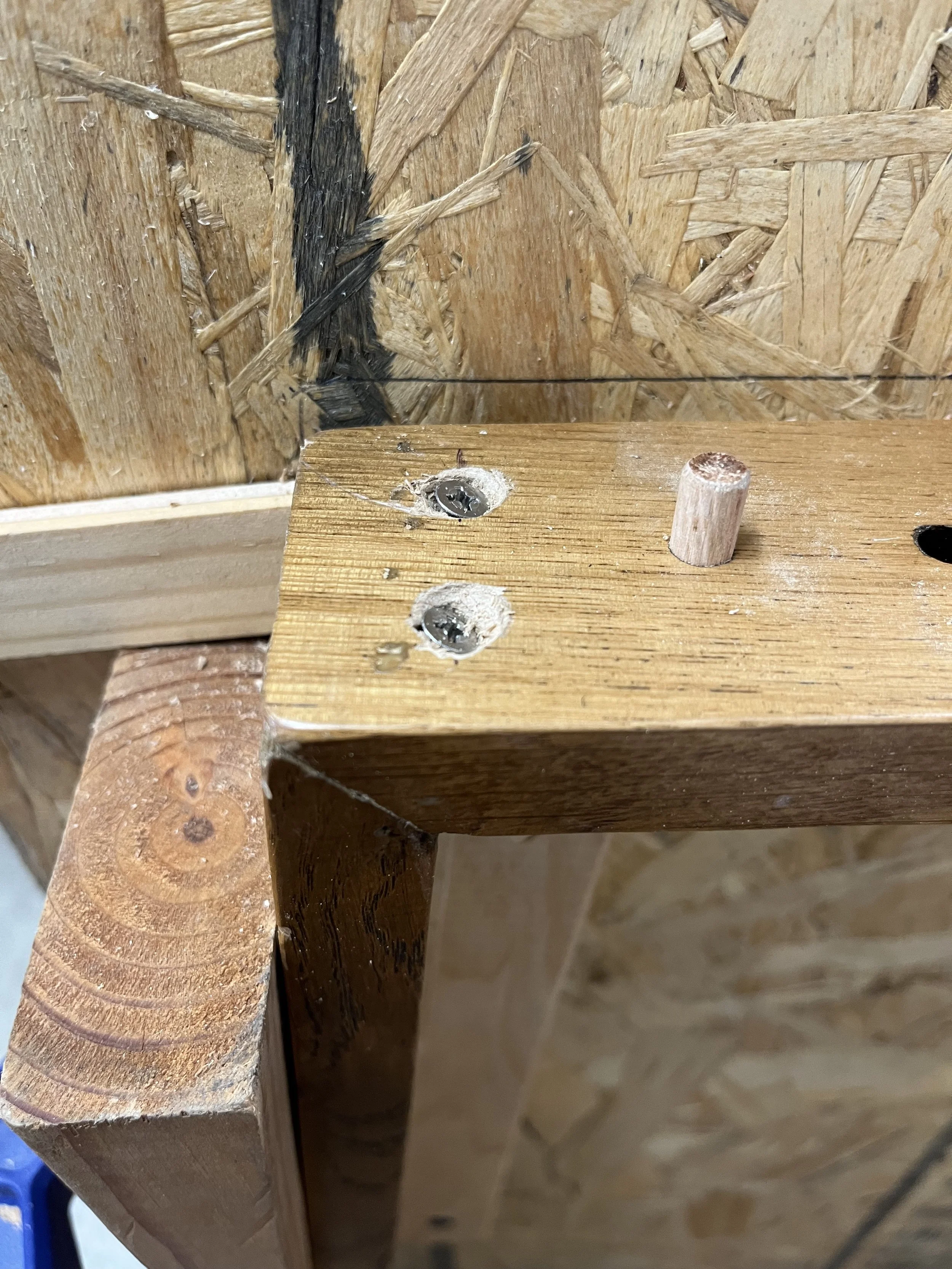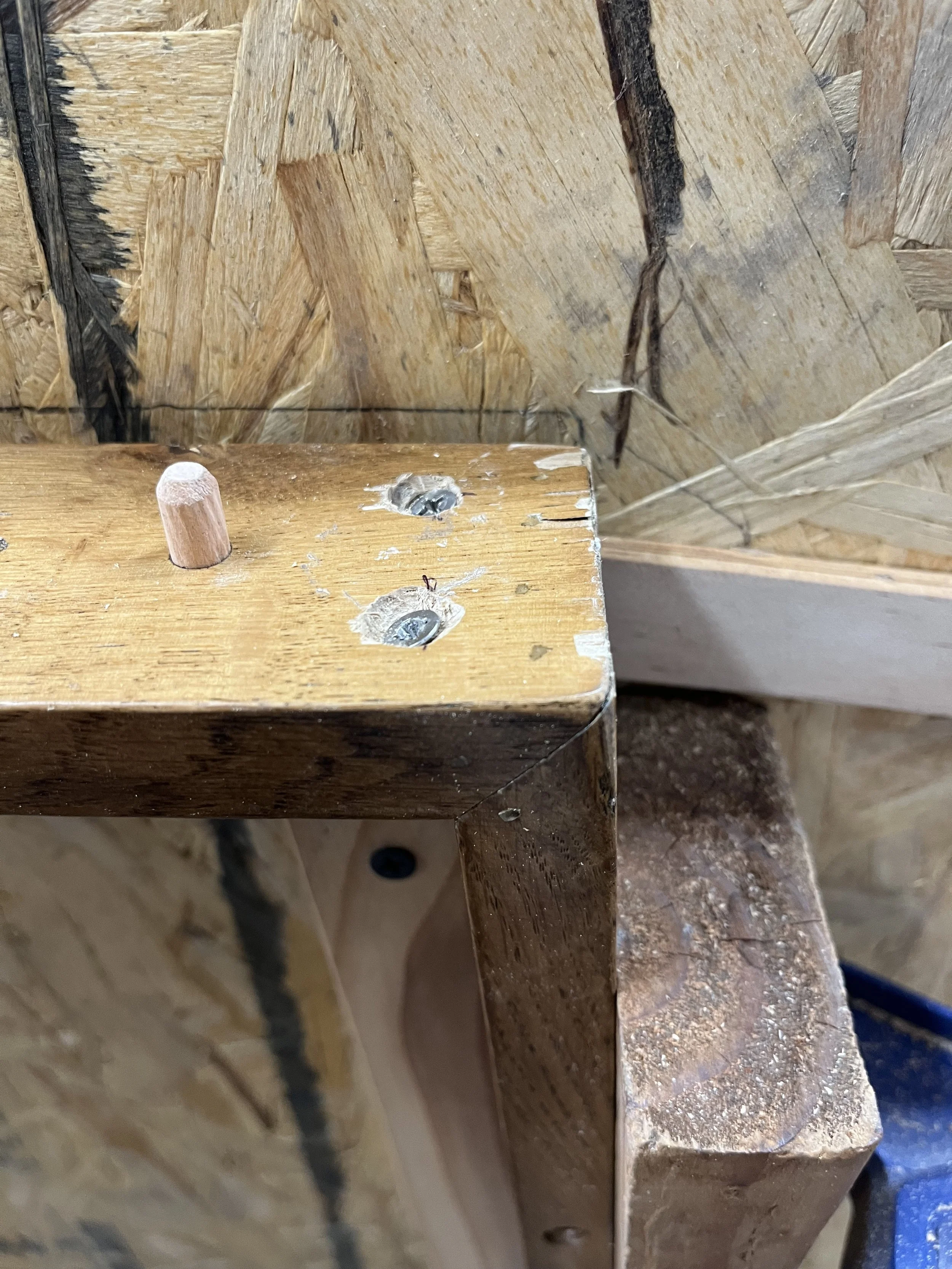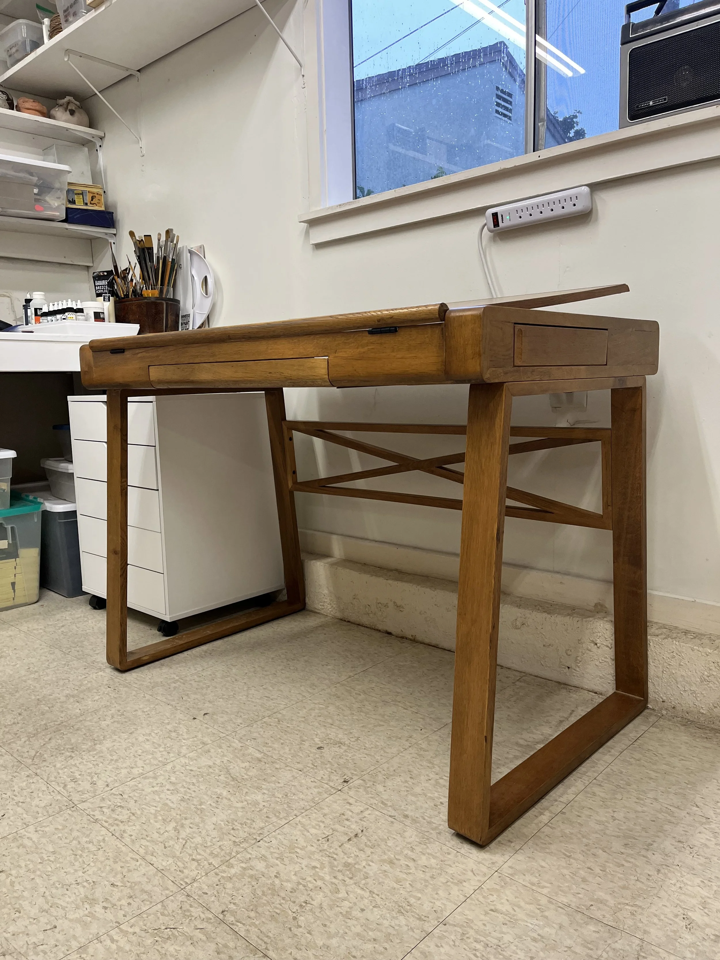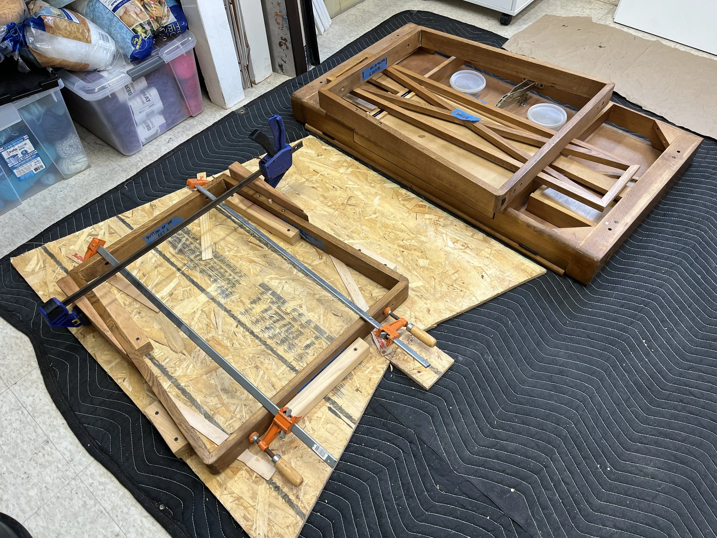 Art Desk Repair: One side of the desk had broken apart in several sections. A custom jig was constructed to allow realignment and gluing. Stainless steel screws were inserted invisibly to replace the original fractured pegs (tenons). The desk is now solid and very sturdy.