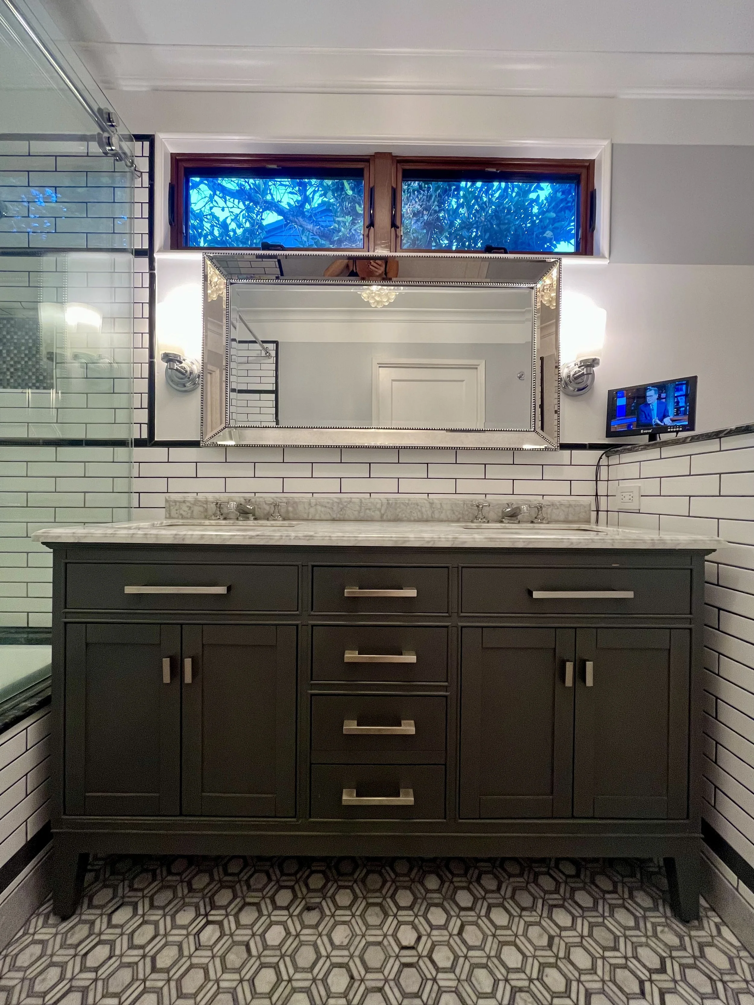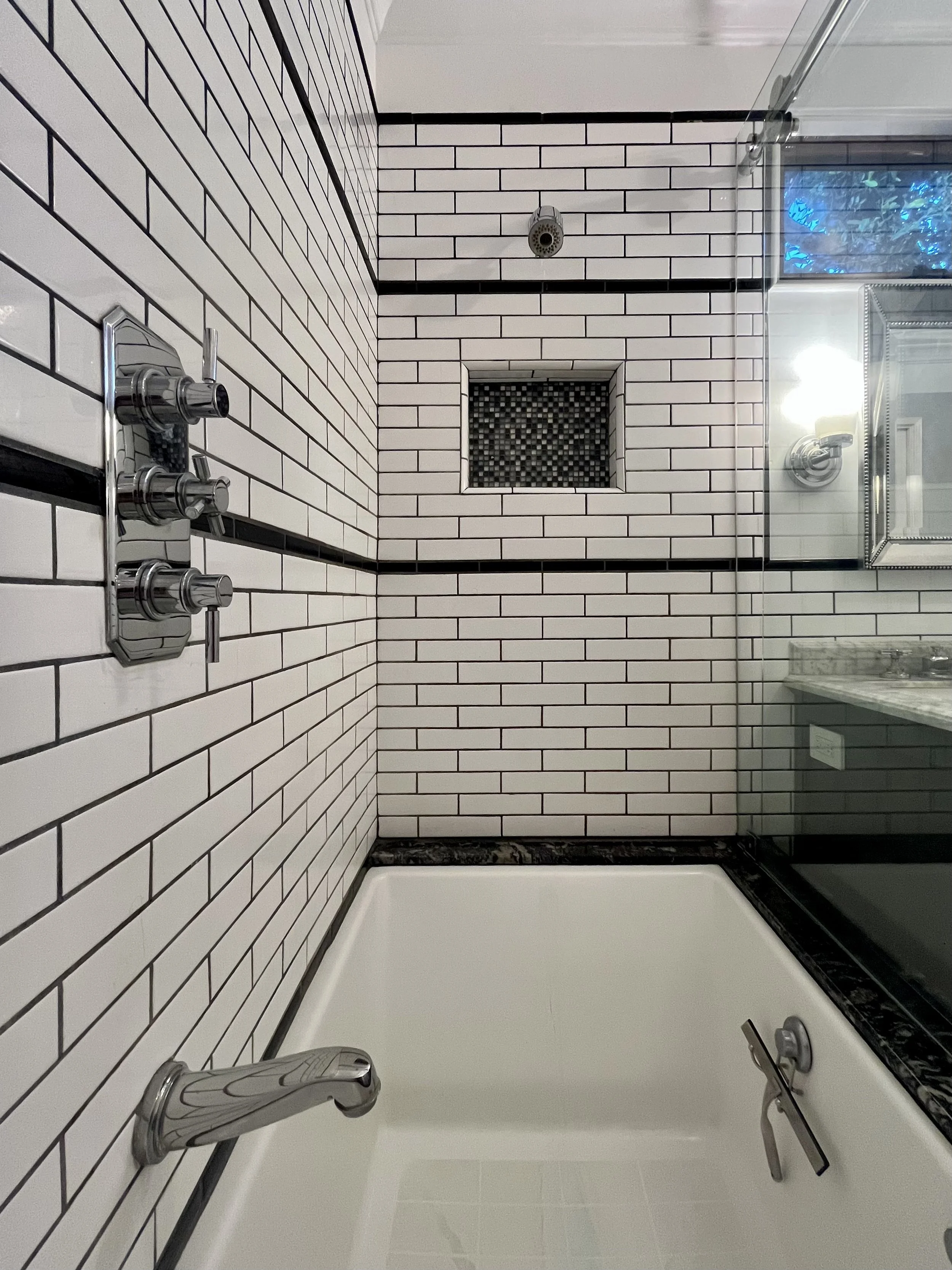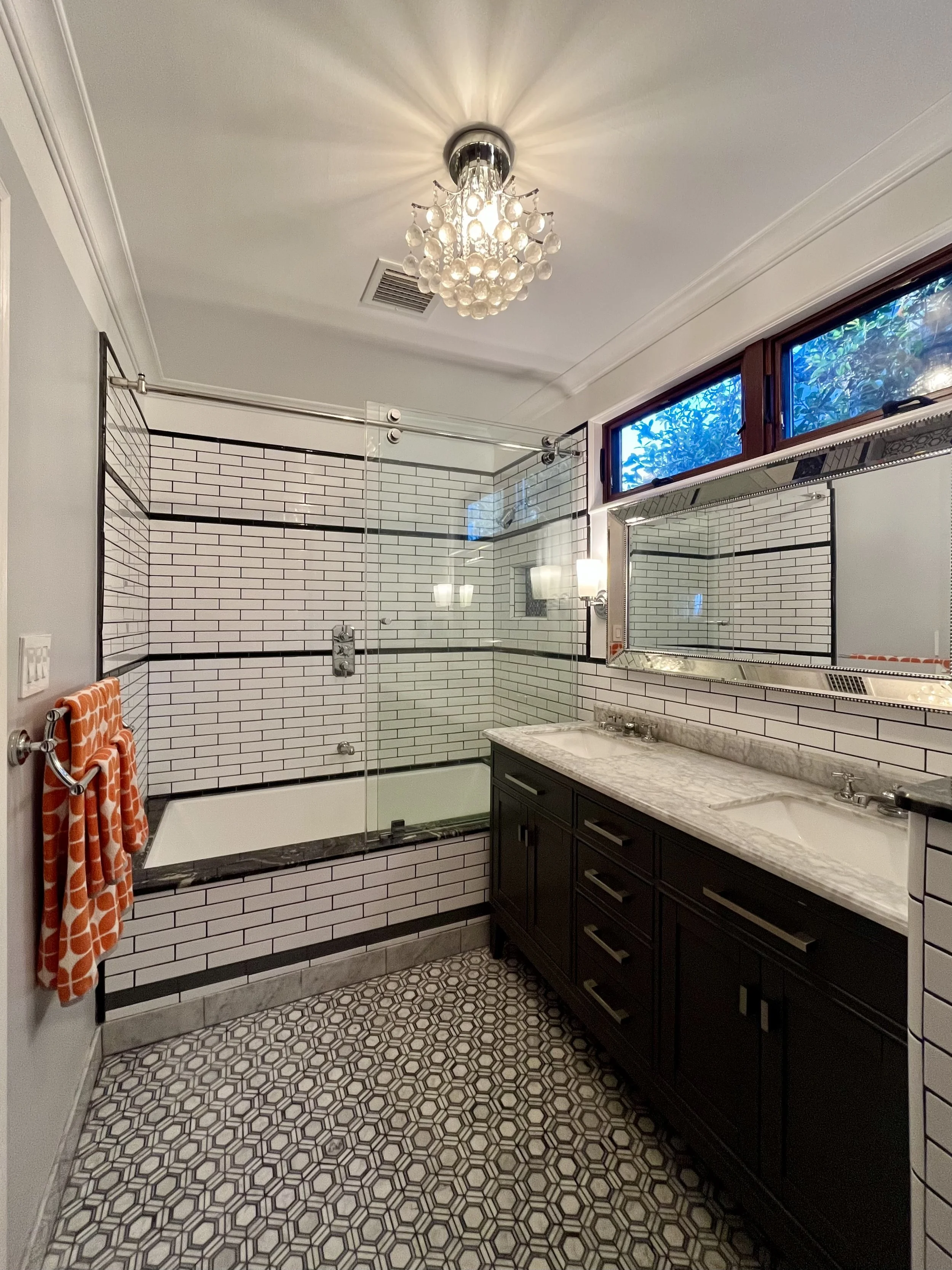 Bathroom Design: Created a new master bath in the space of a tiny remodeled bedroom. Unique tilework patterns and paint choices, as well as careful detailing, serve to make the new bathroom feel spacious, elegant and bright.