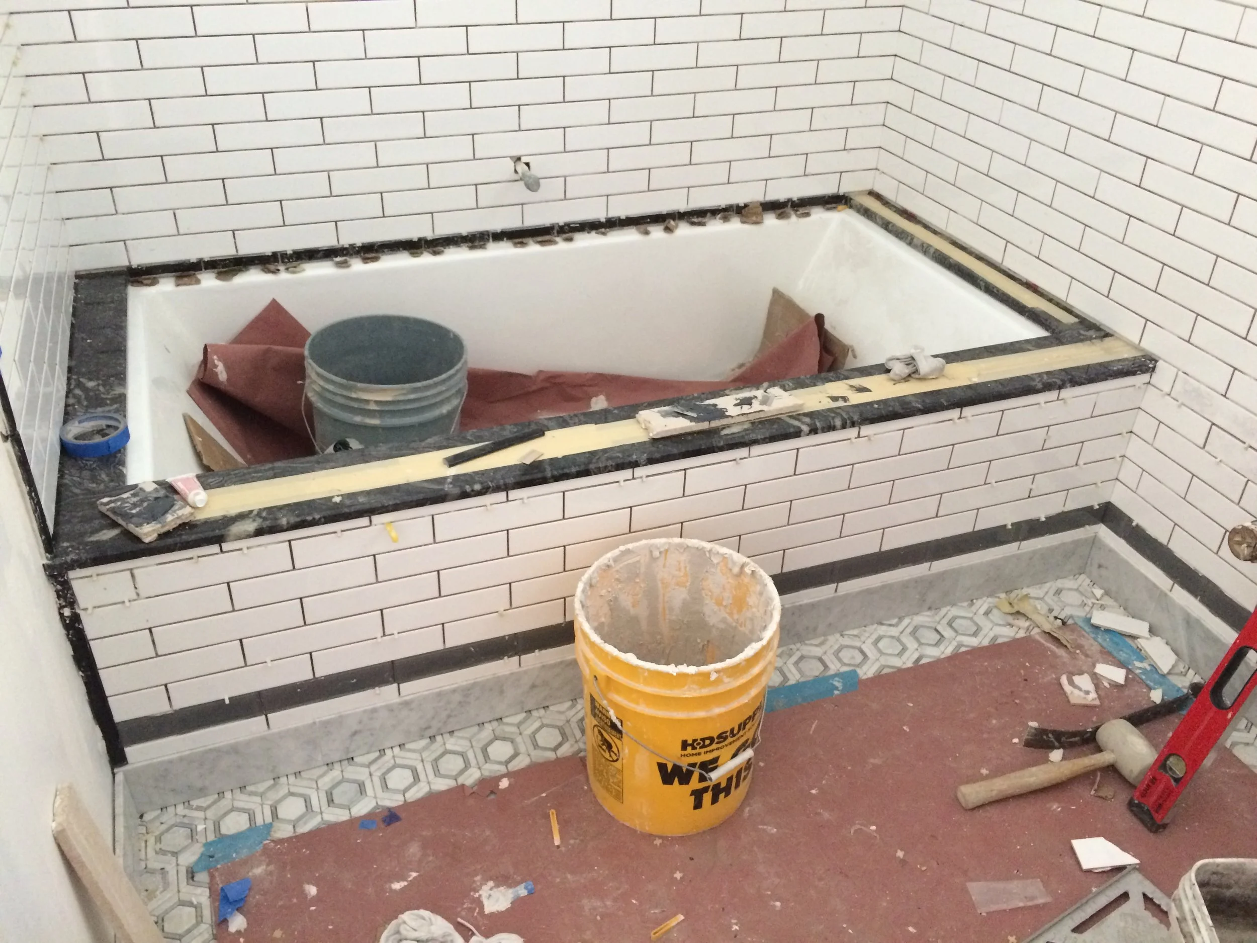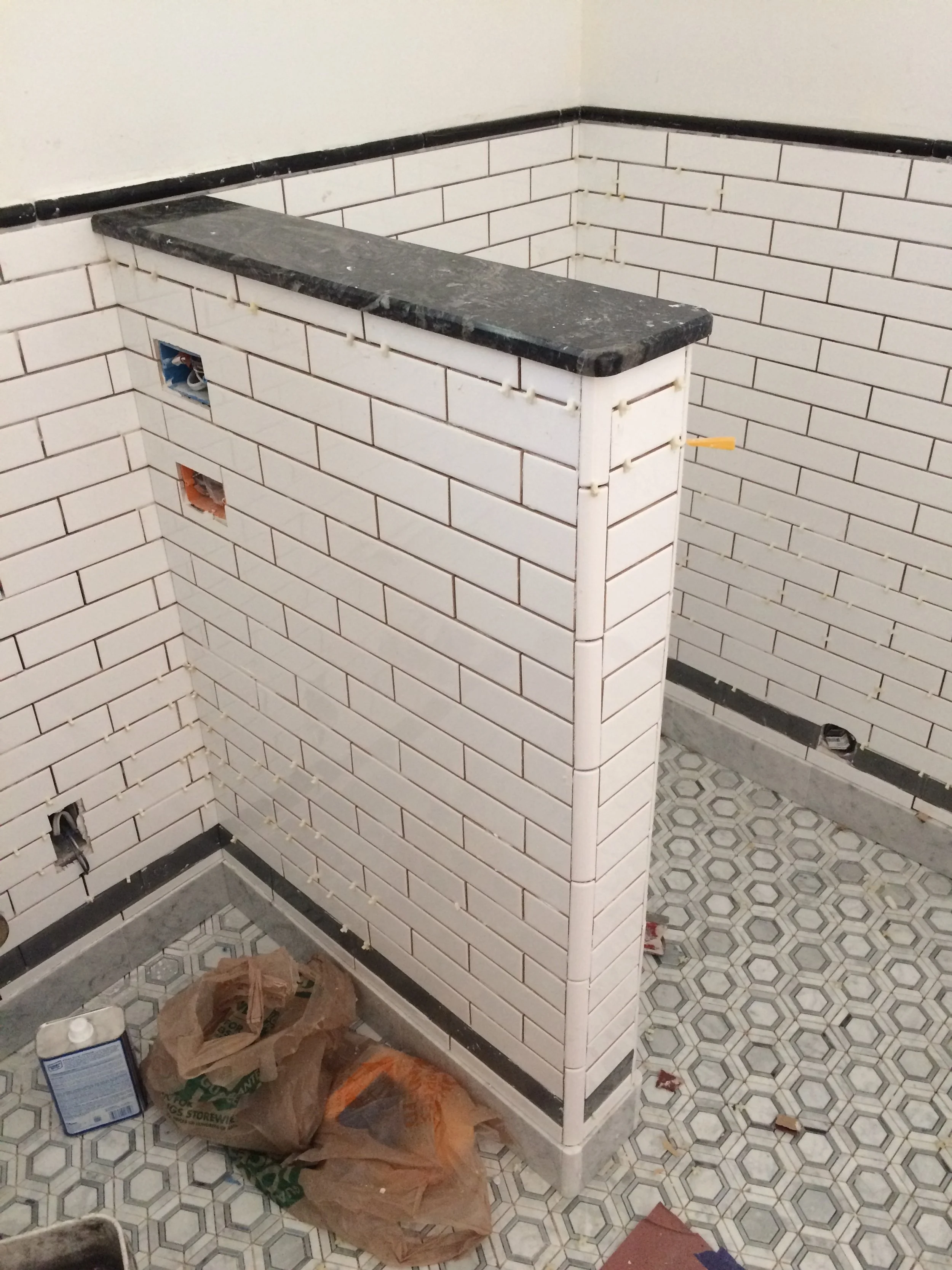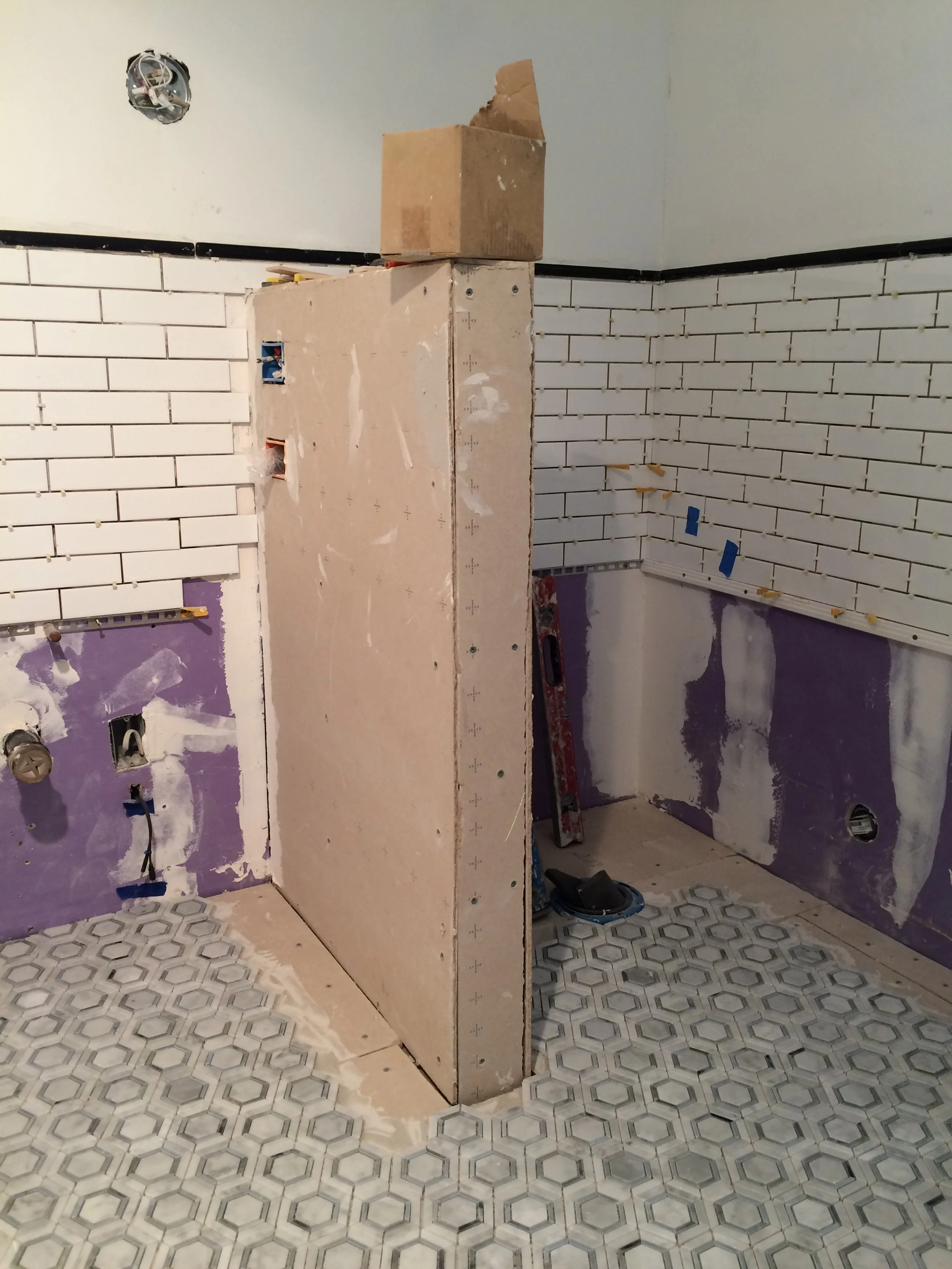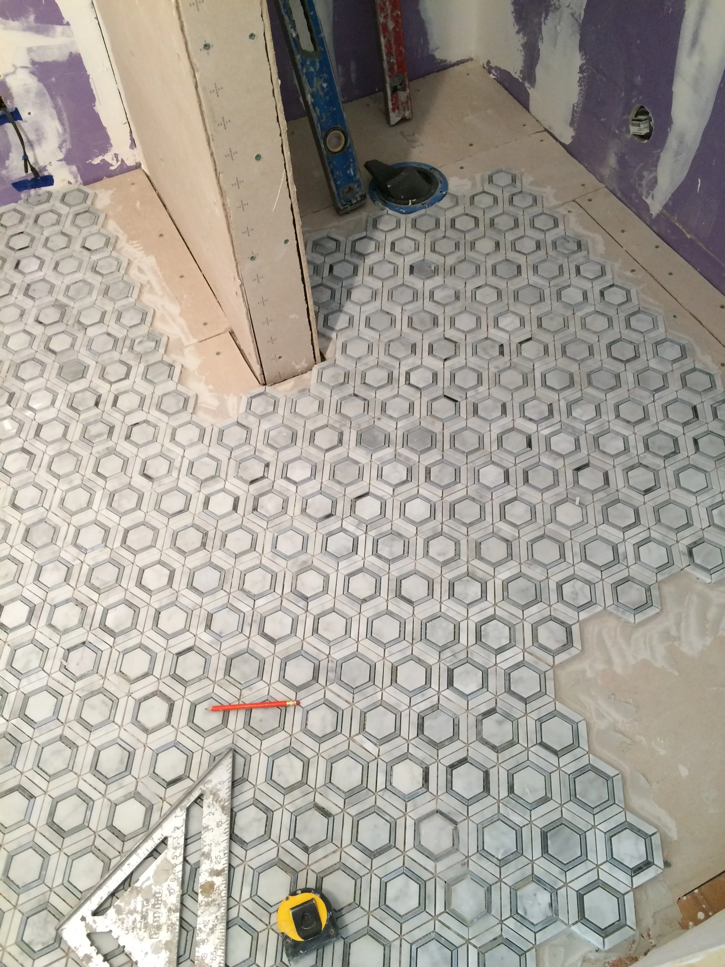 Bathroom Design: Created a new master bath in the space of a tiny remodeled bedroom. Unique tilework patterns and paint choices, as well as careful detailing, serve to make the new bathroom feel spacious, elegant and bright.